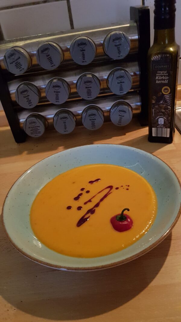 Okaido(gelb und orange),als pikante Suppe mit Möhren und Kokosmilch